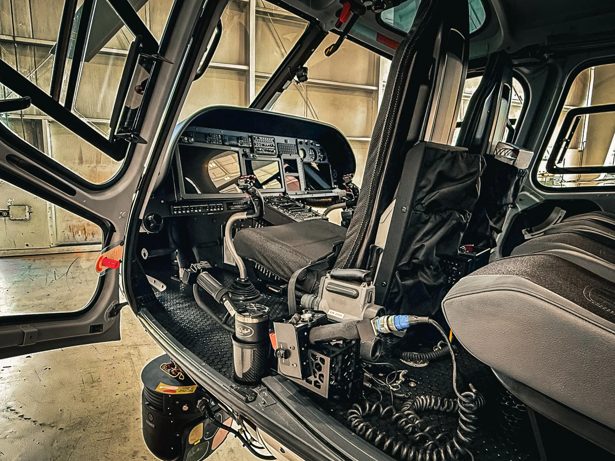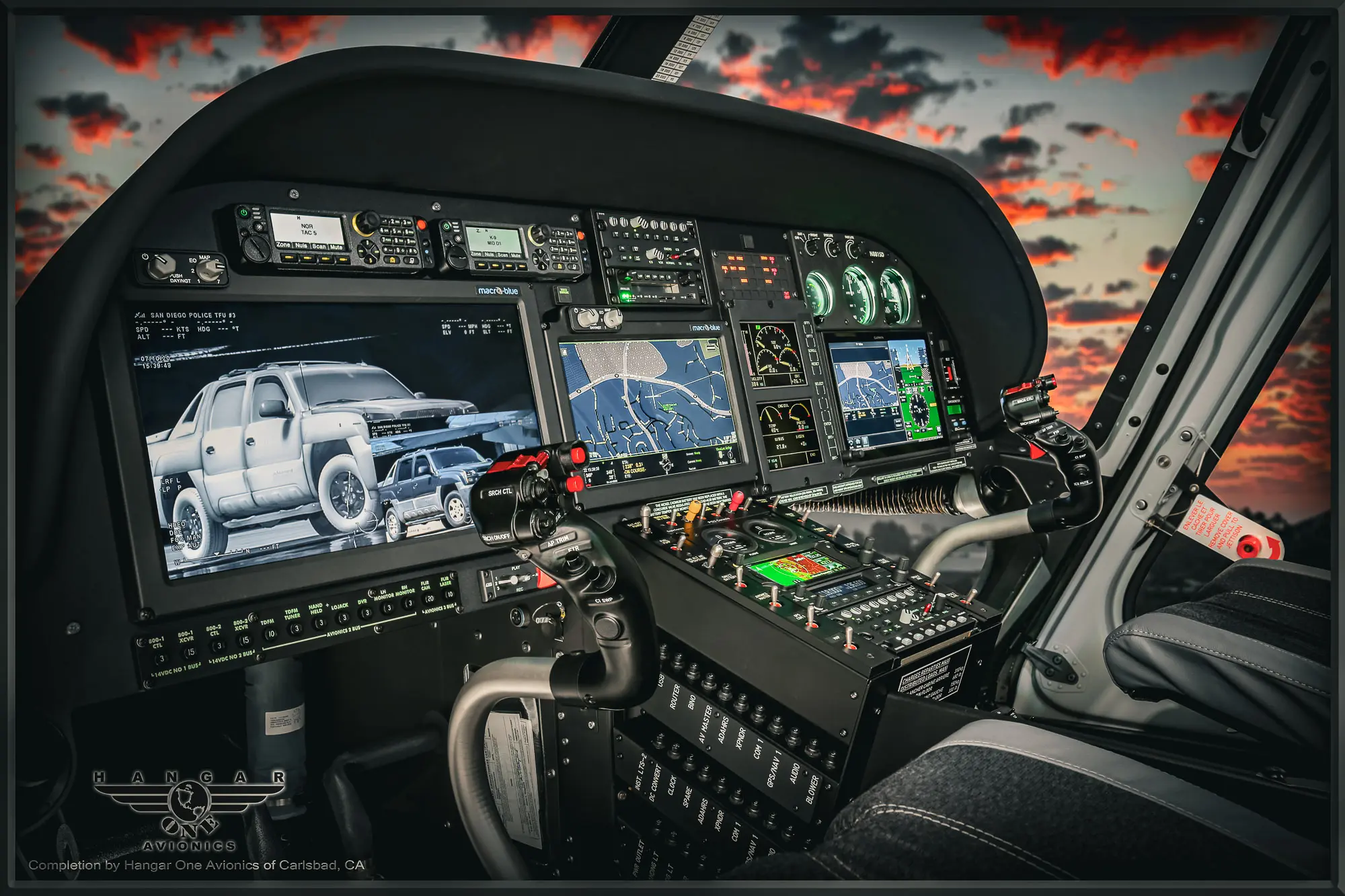 The configuration includes a Garmin G500H TXi glass cockpit, HeliSAS autopilot, radar altimeter, and ADS-B capabilities. Integrated communications feature a full digital audio system, dual Garmin radios, multiband transceivers, and tactical radio support. A FLIR Star Safire 380HDC camera system, Shotover mapping suite, dual video displays, and a dedicated downlink system enable high-clarity surveillance and situational awareness. Additional enhancements include NVIS lighting, advanced searchlights, mini cams, and a robust airframe upgrade package—all engineered by Hangar One to meet the demands of urban law enforcement missions in our hometown of San Diego.